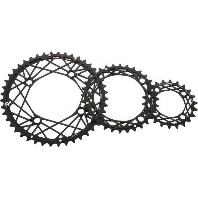 Die in verschiedenen Ausführungen und Farben erhältlichen Kettenblätter der K3 Cob Web Serie stellen an jedem Bike einen Hingucker dar, denn ihr extrem aufwändiges Design dürfte im Bike-Bereich seinesgleichen suchen. Die optisch einem Spinnennetz nachempfundene und im CNC-Fräsverfahren hergestellte äußerst filigrane Struktur dieser Kettenblätter sorgt trotz eines extrem niedrigen Gewichts für eine hohe Steifigkeit und gute Schaltleistung. Im Sinne einer guten Haltbarkeit und eines ansprechenden Aussehens sind die Oberflächen eloxiert, während die Herstellung aus hochfestem 7075 Aluminium für eine dauerhaft zuverlässige und präzise Funktion sorgt.