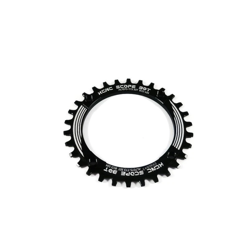 Das Scope-Kettenblatt von KCNC wurde speziell für 1-fach Antriebe entwickelt und verfügt über ein spezielles Narrow-Wide-Profil, bei dem jeder zweite Zahn schmaler ist als der andere. Hierdurch wird ein sehr sicherer und spielfreier Lauf der Kette auf dem Kettenblatt realisiert, was sich in deutlich weniger Kettenabwürfen und einer höheren Betriebssicherheit niederschlägt. Die in einem sehr präzisen CNC-Fräsverfahren aus hochfestem 7075 Aluminium hergestellten Kettenblätter besitzen einen Lochkreis von 104 mm und integrierte Befestigungsgewinde, so das lediglich vier Kettenblattschrauben und keine Muttern erforderlich sind. Die robuste Materialstärke von 5 mm sorgt für eine überragende Steifigkeit dieser in verschiedenen Farben und Zähnezahlen erhältlichen Kettenblätter, die über eine haltbare und optisch ansprechende Eloxierung incl. aufwändiger Lasergravuren verfügen.