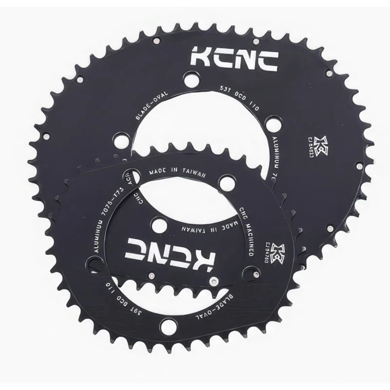 Aufgrund ihrer positiven Eigenschaften setzen sich ovale Kettenblätter immer mehr durch. Die Vorteile ovaler Blätter liegen darin, dass sie im Bereich der höheren biomechanischen Leistungsfähigkeit ein größeres Übersetzungsverhältnis bieten und im Gegenzug das Überwinden der Totpunkte erleichtern. Zahlreiche Profis machen sich diese Vorzüge bereits zu Nutze und auch die ovalen Kettenblätter von KCNC setzen genau an diesem Punkt an. Das auffälligste Merkmal der KCNC-Kettenblätter der Oval-Serie ist deren fast rechteckiges Design, wodurch eine höhere Effizienz beim Pedallieren erreicht wird. Die Blätter sind darüber hinaus vollständig geschlossen, wodurch eine hohe Steifigkeit realisiert werden konnte, was sich unter anderem positiv auf die Schaltperformance auswirkt. Die aus langlebigem 7075 Aluminium präzise CNC-gefrästen Kettenblätter überzeugen mit einer langen Lebensdauer und einem sehr guten Schaltverhalten. Für einen optisch perfekten Auftritt sorgen die hochwertig eloxierten Oberflächen, welche darüber hinaus mit aufwändigen Lasergravuren versehen sind. Die Kettenblätter der Oval-Serie sind in verschiedenen Farben und Ausführungen für den Einsatz am Rennrad erhältlich.