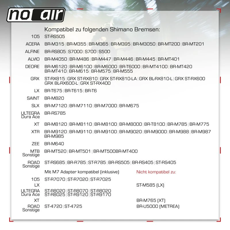Generell sollte das Entlüftungskit auch zu anderen Shimano Bremsen kompatibel sein, allerdings haben wir neben den angegebenen Modellen keine anderen Modelle entlüftet. Sollte Dein Modell nicht hier aufgeführt sein, bieten wir gerne an, Dir ein Kit zuzusenden, das Du auch nach Benutzung gebraucht zurücksenden kannst, wenn das Kit nicht kompatibel ist. Bitte gib‘ uns in dem Fall an, welches Modell Du versucht hast zu entlüften, damit unsere Inkompatibilitätsliste ergänzen können.