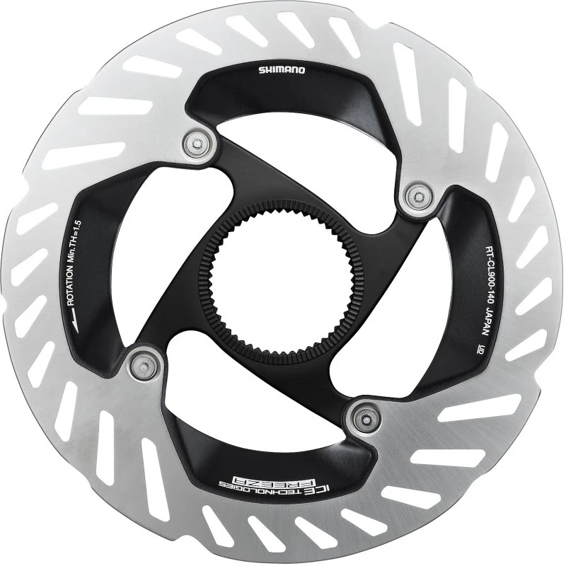 Mit den optisch sehr eigenständigen Ice Tech Bremsscheiben ist es Shimano gelungen, trotz extremer Leichtbauweise ein effektives Wärmemanagement zu realisieren. Die spezielle Sandwich-Konstruktion des Reibrings basiert auf einem Aluminiumkern mit integrierten Kühlrippen der von Edelstahlflanken umgeben ist. Durch die Sandwich Bauweise kann eine hohe Bremsleistung bei gleichzeitig überragender Haltbarkeit realisiert werden. Um die Geräuschentwicklung und eine Wärmeübertragung auf die Nabe zu verhindern, ist die RT-CL900 als Floating Disk ausgeführt, was bedeutet, dass der Reibring über eine Vernietung mit der Trägereinheit aus Aluminium verbunden ist.