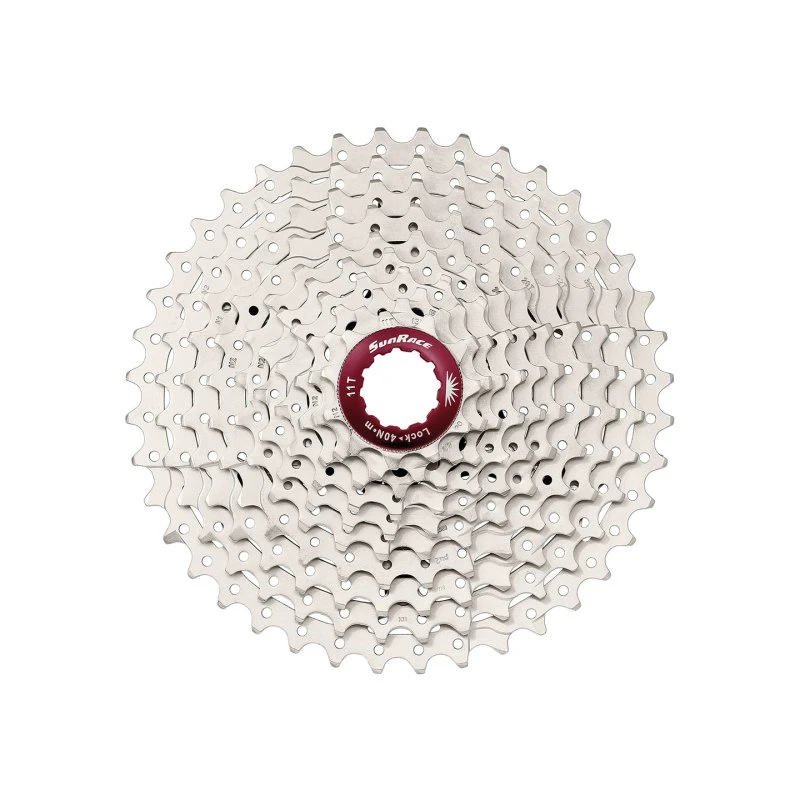 Die CSMX3 Kassette von SunRace bietet eine extrem breite Entfaltung, wodurch sie sich bestens für verschiedenste Einsatzbereiche eignet. Du entscheidest, welche Bandbreite du benötigst und kannst aus vier verschiedenen Abstufungen von 11-40 Zähnen bis hin zu 11-47 Zähnen wählen. Der grundsätzliche Aufbau alle drei Ausführungen der CSMX3 Kassette ist jeweils identisch und besteht aus robusten, rot eloxierten Aluminiumspidern, auf welchen die Ritzel mit einer dauerhaften Vernietung montiert sind. Das jeweils größte Zahnrad wird aus haltbarem 7005 Aluminium gefräst, während alle anderen Ritzel aus hochbelastbarem Stahl hergestellt werden. Durch die spezielle Gangabstufung wird jeweils ein passender Berggang, wie auch ein entsprechend langer Gang für flotte Flachpassagen zur Verfügung gestellt, wodurch der Einsatzbereich dieser Kassetten sehr vielfältig ist. Mit Hilfe der Fluid Drive Plus™ Technologie werden jederzeit zuverlässige und geschmeidige Gangwechsel auch unter Last realisiert, während die schwarz, bzw. silber veredelten Oberflächen neben den rot eloxierten Spidern der Kassette ein wertiges Aussehen verleihen und die Zahnkränze wirkungsvoll vor Korrosion schützen. Die SunRace CSMX3 kann problemlos mit den 10-fach Antrieben von SRAM und Shimano kombiniert werden.