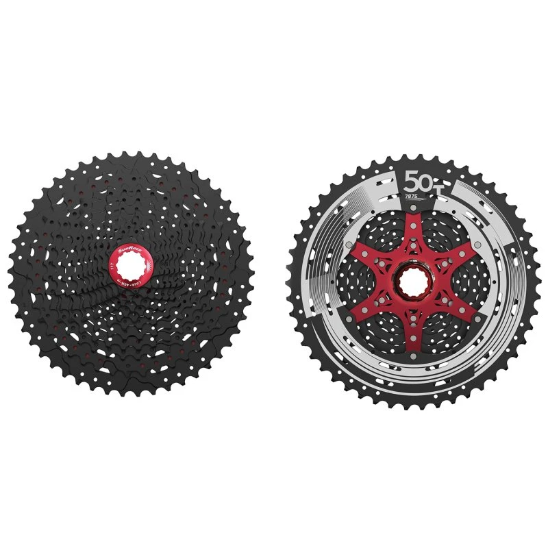 Mit der CSMZ90 bietet SunRace eine 12-fach Kassette, die über eine Bandbreite von imposanten 455% verfügt und sich auf allen Freiläufen nach dem klassischen Shimano/SRAM-Standard (NICHT SRAM XD) montieren lässt. Für eine höchstmögliche Steifigkeit und Schaltgenauigkeit sind jeweils insgesamt 7 Zahnräder auf zwei Spidern aus Aluminium montiert, während die kleineren Ritzel lediglich aufgesteckt und mit Hilfe des Verschlussrings sicher in Position gehalten werden. Zur Gewichtsersparnis ist das größte Zahnrad aus haltbarem 7075 Aluminium hergestellt und auf der Rückseite mit einer optisch ansprechenden Lasergravur versehen. Die Fluid Drive Plus™ Technologie sorgt für jederzeit zuverlässige und geschmeidige Gangwechsel auch unter Last, während die veredelten Oberflächen der Kassette ein wertiges Aussehen verleihen und die Zahnkränze wirkungsvoll vor Witterungseinflüssen schützen. Die Befestigung auf dem Freilaufkörper erfolgt über einen roten Verschlussring aus Aluminium.